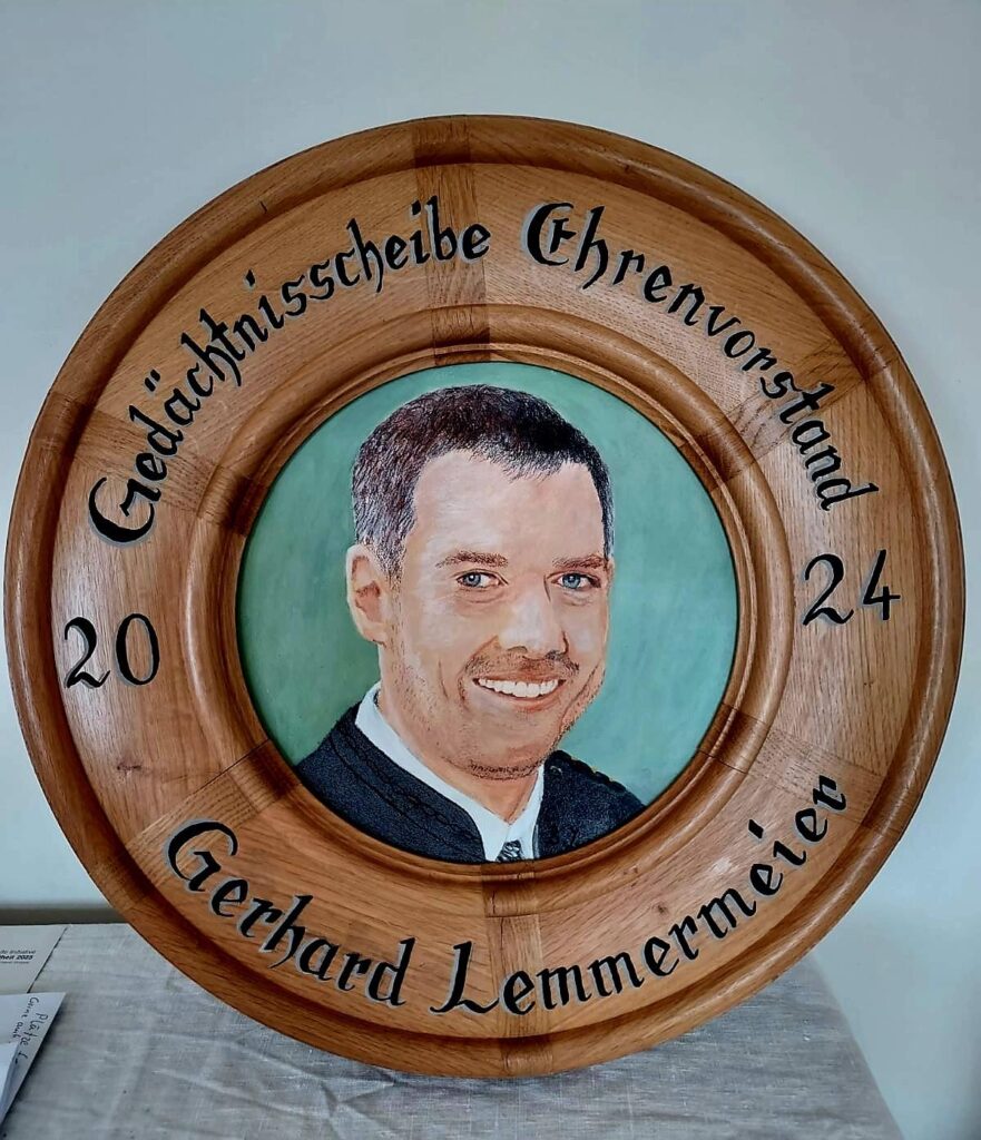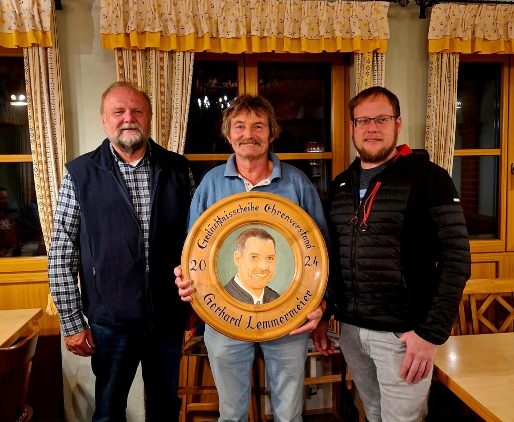 Zum Gedenken an unseren im Jahr 2024 viel zu früh verstorbenen Vorstand Gerhard Lemmermeier ließ der Verein eine Schützenscheibe fertigen. Diese wird künftig jährlich zum Anfangsschießen an den besten Teilerschützen vergeben. Den ersten Titel sicherte sich Georg Maier mit einem 55,6 Teiler. 1. und 2. Schützenmeister, Robert Wagner und Ralph Lallinger gratulierten.
